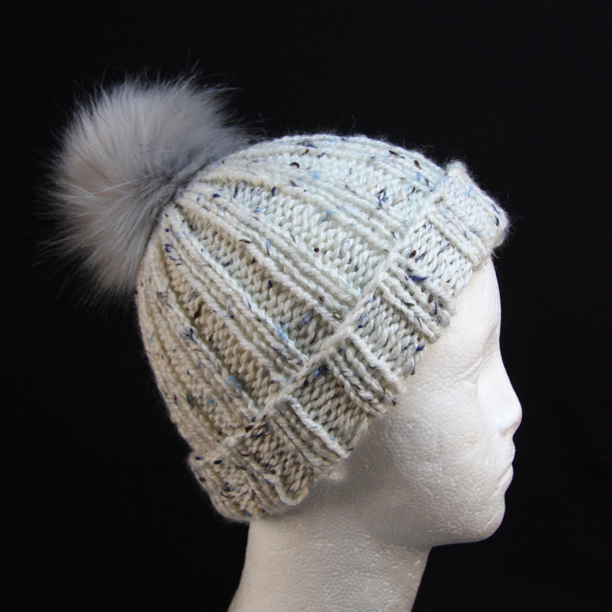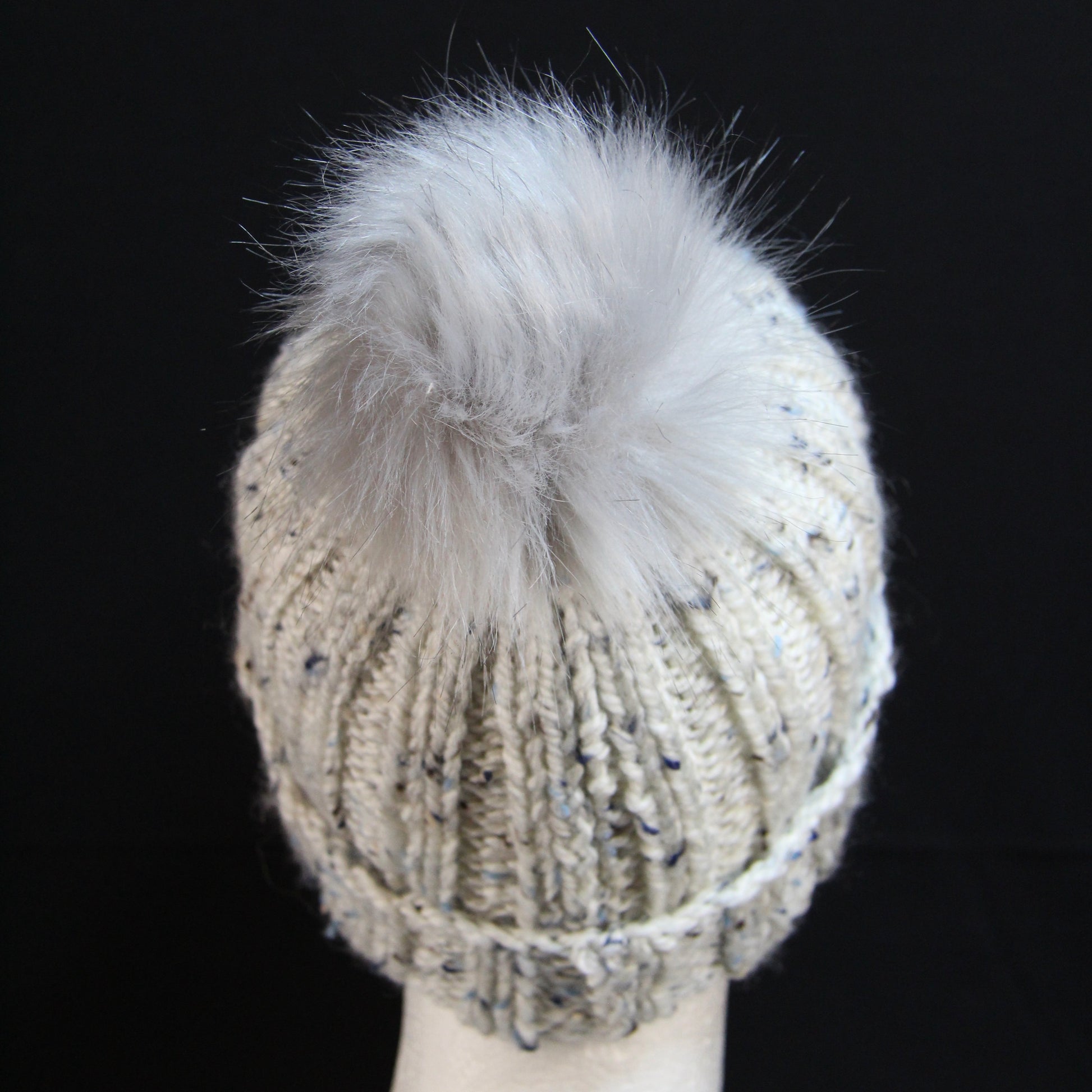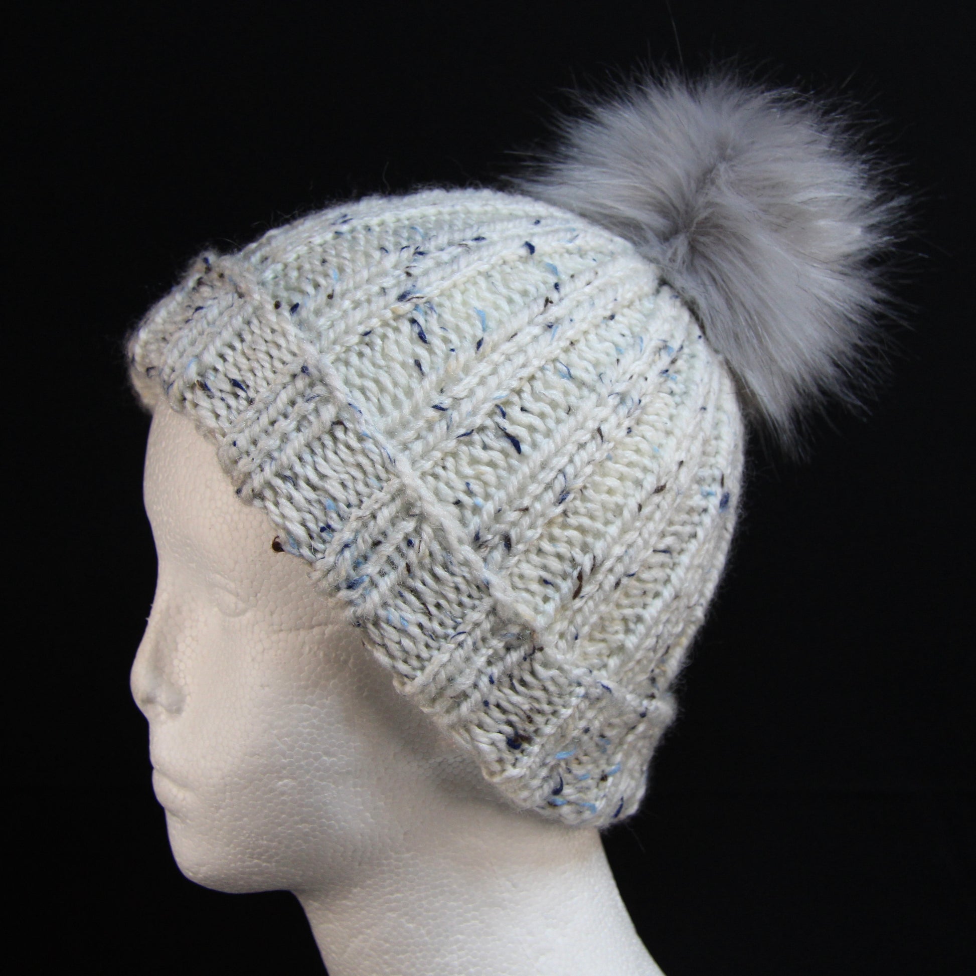 Chunky double rib hat with turned up brim and faux fur pom pom detail, in supersoft tweed effect yarn.