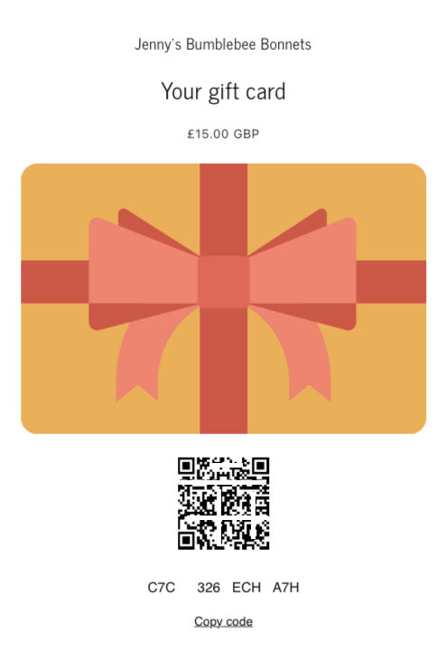 When you buy a Jenny's Bumblebee Bonnet Gift card you will receive a Text message with a link to the voucher. ( You will receive a second text with proof of purchase)