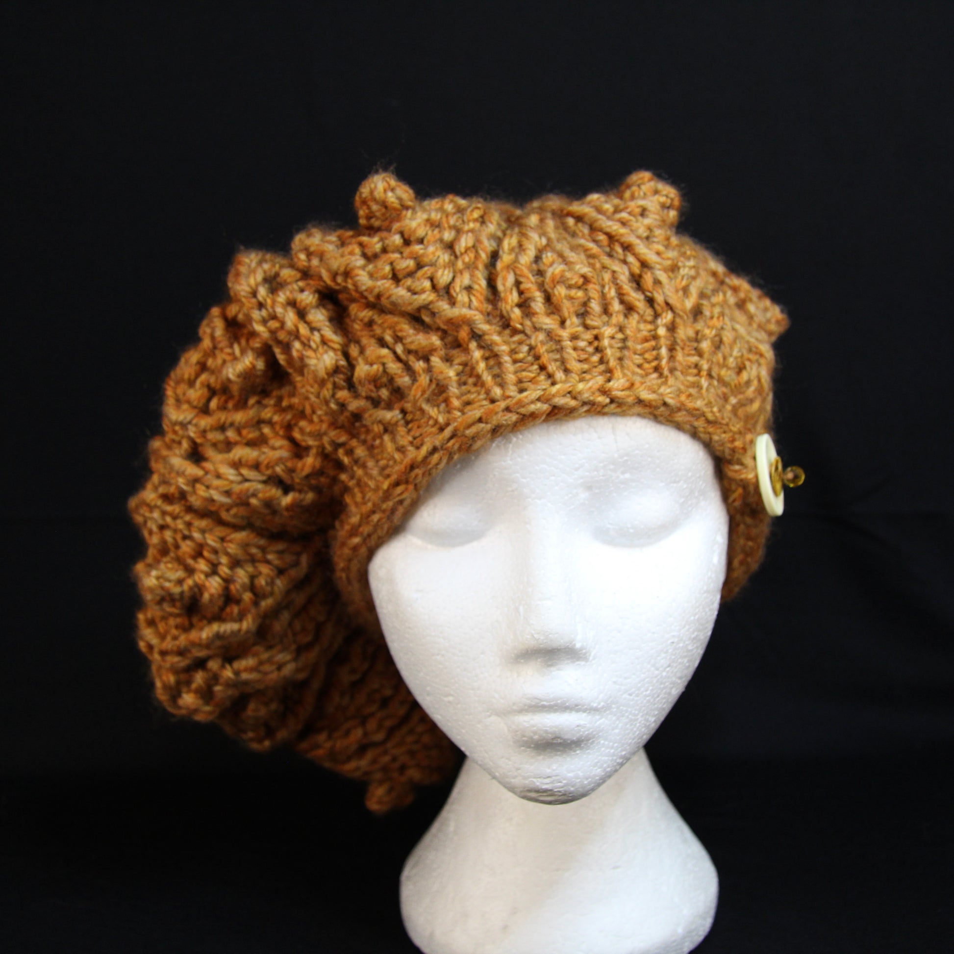 In the search to recreate a hat I had seen wandering past at Glamis Castle Christmas Market, I've spent a lot of time looking at leaf motifs. This Tam is based on a pattern I found by Drops Design, Posh Petals though this one is worked in super chunky yarn producing this glorious textured oversized Tam with button and Swarovski bead detail.